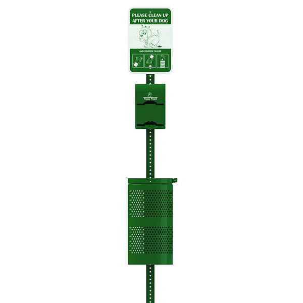 Pet Waste Station, Rectangular, Flat, 10 gal, Green, Height 96 in, Width/Diameter 13 1/2 in, Depth 13 1/4 in, Metal, Galvanized Steel, Powder-Coated, Stationary, Lid Included, Hinged, None, Pole-Mounted