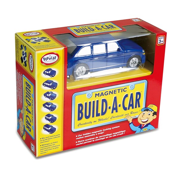 Ever wish you could design your own car or truck? Well, now you can with Build-A-Car! You'll feel like a junior mechanic as you mix and match eleven magnetic pieces to build a coupe, sedan, pickup, crew cab, sport SUV, or full sized SUV. Want to change something or to build a truck instead of a car? No problem, our hidden magnetic locking system allows you to snap pieces together and take them apart again and again. It's "Creativity on Wheels!" Warning - Choking Hazard - Small Parts. Not for children under 3 yrs. Simple construction using magnetic pieces. Recommended for ages 3-6 years. Includes 4 wheels and 7 auto body parts to construct 6 different vehicles.