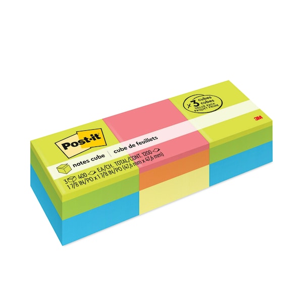 Post-it® Notes Cubes are great to have on your desk or counter so you never run out of notes for great ideas. They stick securely and remove cleanly, featuring a unique adhesive designed for use on paper. More notes per pad than any other Post-it® Note. The colors add a pop of style to your desk. Post-it® Notes are recyclable.