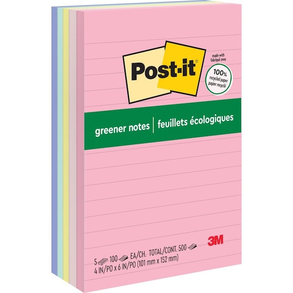 Post-it Greener Notes help support a better future by using recycled paper and plant-based adhesive. With lines to keep your notes straight, these self-stick removable notes stick securely and remove cleanly. Capture important details with the 4" x 6" size. The Helsinki color collection is airy and clean, honoring the simple pleasures of Scandinavian living. Greener Post-it Notes are recyclable, and the paper in Post-it Notes is sourced from certified, renewable and responsibly managed forests.