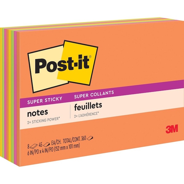 Post-it Super Sticky Meeting Notes stick practically anywhere so you can display your notes and stay on track. Use to post and then organize thoughts and ideas on meeting room walls. Great for making meetings more productive, Super Sticky Notes hold longer and stronger than original notes yet remove cleanly. Notes stick to almost any surface like walls and doors. The Rio de Janeiro Color Collection is expressive and dramatic with colors celebrating this Brazilian metropolis. Super Sticky Post-it Notes are recyclable, and the paper in Post-it Notes is sourced from certified, renewable and responsibly managed forests.