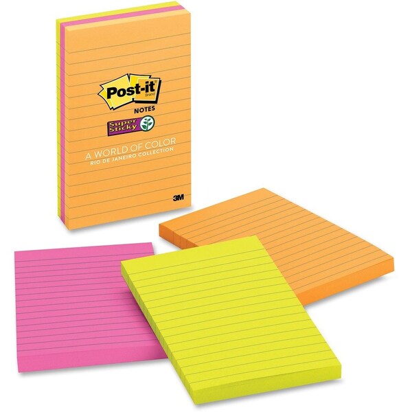 Post-it Super Sticky Notes feature a unique adhesive so your notes will stick securely to more surfaces. Now you can stick your notes where they'll really get noticed - like monitors, doors and walls. With lines to keep your notes straight, 4" x 6" size is perfect for capturing important details or making lists. Super Sticky Notes hold longer and stronger than original notes yet remove cleanly. The Rio de Janeiro Color Collection is expressive and dramatic with colors celebrating this Brazilian metropolis. Super Sticky Post-it Notes are recyclable, and the paper in Post-it Notes is sourced from certified, renewable and responsibly managed forests.
