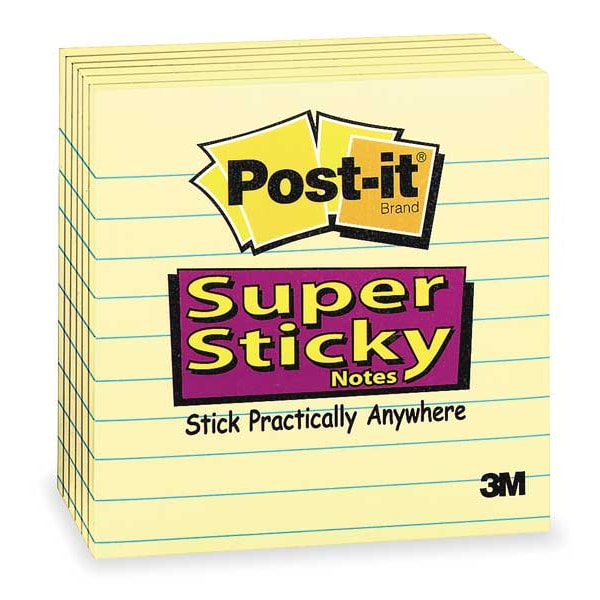 Sticky Notes, 4 in x 4 in, Adhesion Super Sticky, Color Yellow, Recycled Content 0 Percent, Sheets per Pad 90, Rule Ruled, Pads per Pack 6, Package Quantity 6