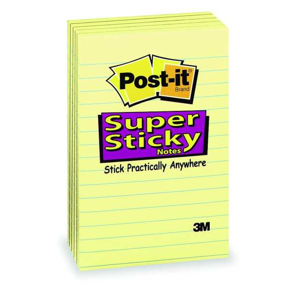 Sticky Notes, 4 in x 6 in, Adhesion Super Sticky, Color Yellow, Recycled Content 0 Percent, Sheets per Pad 90, Rule Ruled, Pads per Pack 5, Package Quantity 5