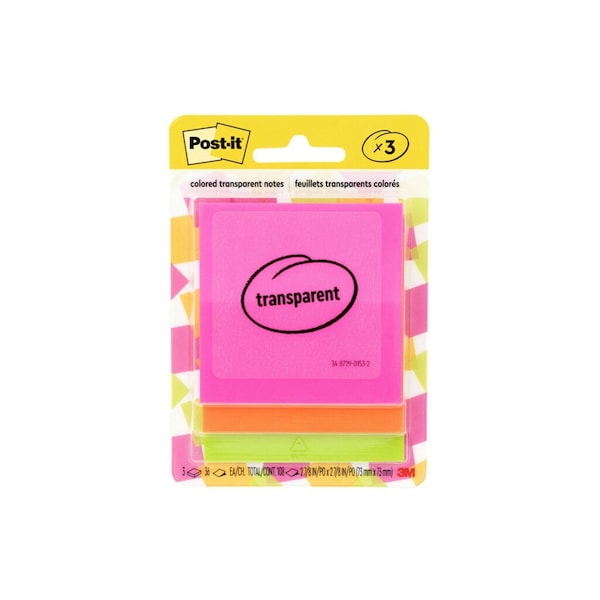 Transparent Notes, Unruled, 2.88x2.88 in., Assorted Transparent Colors, 36 Sheets/Pad, 3 Pads/Pack, 108PK (Discontinued)