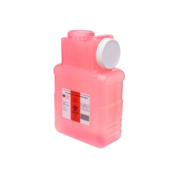 Post medical 1.5 gallon red sharps container with 3 safety column above maximum fill level, consistent total wall thickness ensures puncture-resistance, one-piece construction, on-board screw cap prevents leaks during transport and provides permanent closure once container is filled, mounting brackets available. sold in case quantities of 22, priced per case.