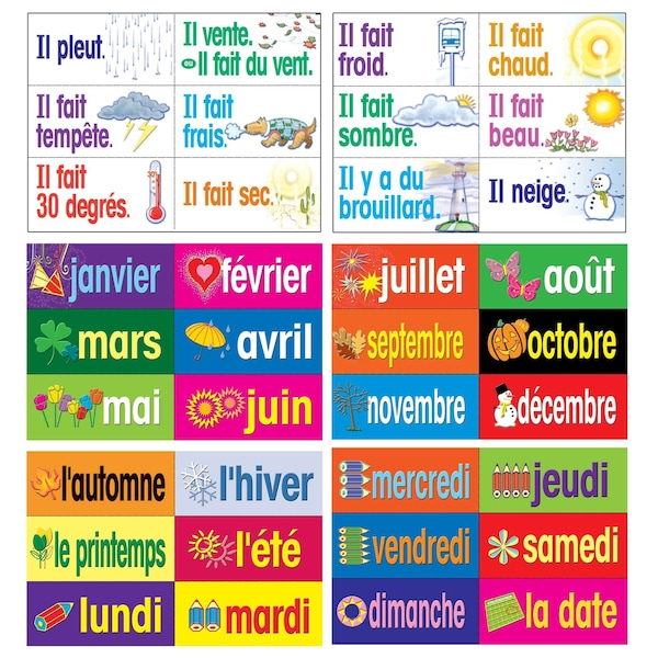Set of 36 versatile, durable cards for chalkboards, bulletin boards, flashcards. Features essential French vocabulary including months, days, seasons, and weather expressions. Cut them out and use these laminated cards for years. Colorful resource that motivates while teaching. Great for classroom and student reference. Made from durable stock. Perfect for the second language learner.