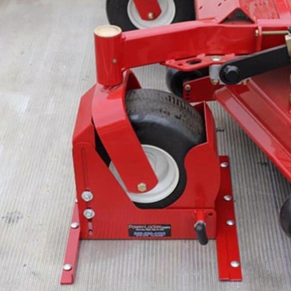 The Power Locker Equipment Tie Down secures wheeled equipment under 1,200 pounds in just seconds. It is the only complete wheel lock system on the market that meets all state and federal laws in one box. It installs securely to the deck of most open or closed trailers. Once in place, simply drive onto the pivoting shoe and it automatically locks into place. To remove the equipment, simply pull the swing pin and drive off. The lock can be completely removed from the floor bracket with a single pin in seconds, freeing the trailer space for other hauling needs. Power Lock comes in three sizes to fit most equipment. All Power Lockers are also interchangeable – the front and rear mounting brackets fit all Power Locker sizes. A padlock can be used for added security, though the Power Locker is not primarily an anti-theft device.