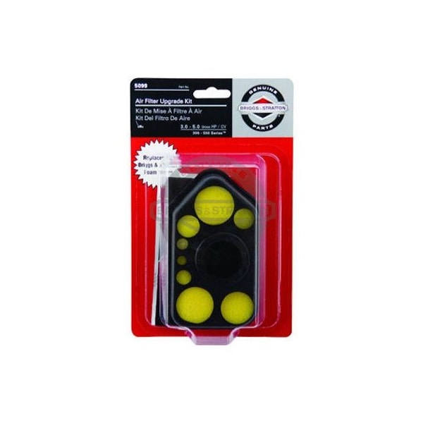 Briggs & Stratton Foam Air Filter. It fits on 2 Hip 5 HP Horizontal Shaft Engines. It is for use with tillers edgers chipper/shredders & other power equipment. It is a DIY version of Briggs Service Part #27987S plus the external air filter assembly. The kit enables complete replacement of rusted out or damaged air filter assembly. It is suitable for Classic Sprint Quattro Engines.
