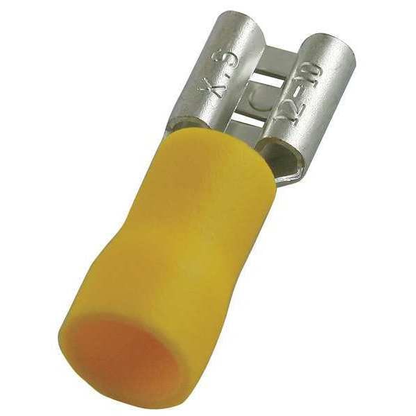Female Disconnect, Contact Finish Tin, Contact Material Brass, Disconnect Style Tab, Insulation Color Yellow, Insulation Coverage Partial Coverage, Insulation Material Vinyl, Maximum Operating Temperature 167 Degrees F, Minimum Wire Size 12 AWG, Maximum Wire Size 10 AWG, Maximum Voltage 300 V, Tab Thickness 0.032 in, Tab Width 0.25 in, Terminal Type Socket, Termination Style Crimp, UL 94 Flammability Rating V-0, RoHS Compliant Yes, Seam Style Butted, Standards UL/cUL Listed