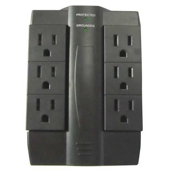 Plug Adapter, Blade End Current Rating 15 A, Blade End Voltage Rating 125V AC, Housing Color Black, Maximum Surge Current 60 kA, Maximum Surge Energy 1,200 J, NEMA Plug Configuration 5-15P, NEMA Receptacle Configuration 5-15R, Number of Outlets 6, Slot End Current Rating 15 A, Slot End Voltage Rating 125V AC, Wattage 1,875 W, Adapter Type Multi-Outlet Tap Surge Protector, Grounding Grounded, Number of USB Ports 0, Power Indicating Light Yes, Surge Protection Yes, Circuit Breaker No