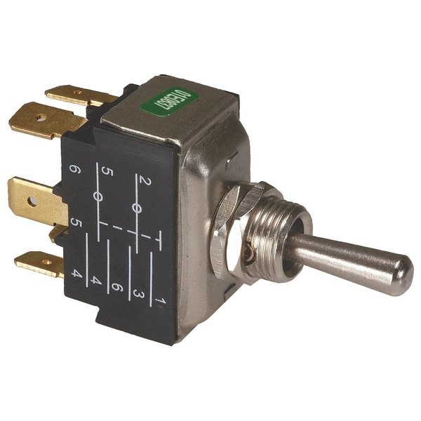 Toggle Switch, Contact Form DPDT, Number of Connections 6, Switch Function Momentary On/Off/Momentary On, AC Contact Rating 15A @ 277V AC, 20A @ 125V AC, HP 1 1/2 hp, Terminals Quick Connect, Mounting Hole 0.50 in dia, Actuator Style Bat, Actuator Length 0.75 in, Stem Length 0.5 in, Stem Dia. and Thread Size M12 x 1-6g, Operating Temp. Range 185 Degrees F, Standards UL Listed
