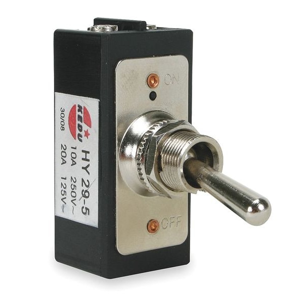 Toggle Switch, Contact Form DPST, Number of Connections 4, Switch Function On/Off, AC Contact Rating 10A @ 250V AC, 20A @ 125V AC, HP 1 1/2 hp, Terminals Screw, Mounting Hole 0.50 in dia, Actuator Style Bat, Actuator Length 0.68 in, Stem Length 0.5 in, Stem Dia. and Thread Size 0.500 in, Operating Temp. Range 185 Degrees F, Standards UL Listed