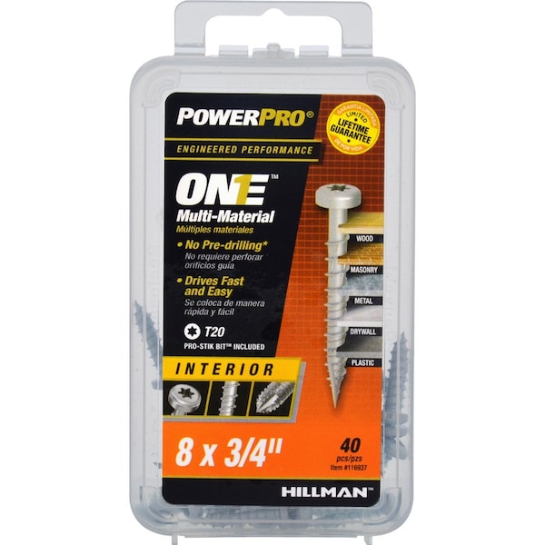 Engineered for optimum performance in multiple materials Power Pro One screws are the One screw you'll ever need. Developed to outperform and replace standard wood sheet metal and concrete/masonry screws the One Screw program simplifies your tool box by using a single innovative engineered screw design to satisfy projects that fasten into wood metal concrete drywall and plastic. This zinc plated screw is ideal for interior applications; it is not recommended for exterior projects or treated lumber. Common applications include electrical plumbing and metal projects. The pan head design and star drive provide an exposed finish look and strong draw-down power. Manufactured with spiral flutes serrated hi-lo threads and a 3-sided pyramid point no pre-drilling is required in wood drywall plastic or metal up to 20 gauge thick. Concrete and masonry applications require a pre-drilled a hole see product packaging for pre-drilling instructions.