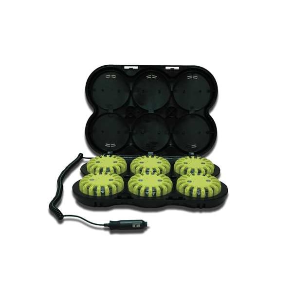 (1) Charging Station, (1) Vehicle Charging Cable 12-24V (CABL-001), (1) Wall Charger (ACDC-001), (6) Lights, (6) Rechargeable Batteries, Red LEDs, Yellow Shells