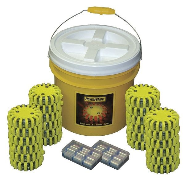 (1) Bucket With Easy-Twist On/Off Lid, (24) Powerflares, (24) Spare Batteries