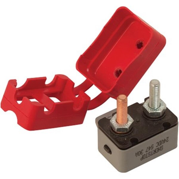Stamped brass/injection molded nylon/polycarbonate. resettable in-line circuit breaker with manual reset button for use with higher amperage accessories.complies with sae standard. j553. splash proof. Features -Resettable circuit breaker with cover Specifications - Ampere: 30 Amp - Voltage: 12 volt to 24 volt - Dimension: 1.75 x 4 x 6 in. - Weight: 0.05 lbs