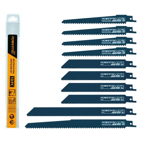 POWERTEC 10-Piece Reciprocating Saw Blade Set - M42 Bi-Metal.Built for demolition, renovation, and heavy-duty cutting, the POWERTEC 14402 10-Piece M42 Bi-Metal Blade Set delivers exceptional durability and cutting power. Made with M42 high-speed steel containing 8% cobalt, these blades provide superior hardness, heat resistance, and wear life, ideal for cutting through metal, wood, aluminum, and even wood with embedded nails. A 10° forward tooth angle ensures aggressive, efficient cutting while minimizing vibration and blade wandering for better control. Each blade features a corrosion- and heat-resistant finish for dependable performance in tough conditions, and the universal shank design fits all standard reciprocating saws. Includes a versatile mix of sizes and TPIs for multiple applications.