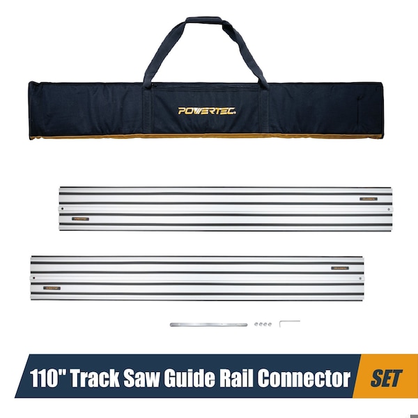 The 55in DeWalt Track Saw Guide Rail Set by POWERTEC. This track saw guide rail and adapter kit fits the DeWalt track saw table series and serves as an excellent OEM replacement. Once the connector locks the guide rail in, it interacts with the saw base and is engineered to deliver strong, precise cuts, routing and trimmings with optimal positioning. Our guide rail replacement set features two 55-inch tracks (longer than the standard 50in), along with a new and approved connector for perfect alignment and to make installation quick and easy. The guides are made with extruded aluminum for anti-corrosive and rust resistant properties. As your woodworking projects get more complex, these tracks deliver accurate and consistent results that you can depend on. Each guide rail has been tested and optimized for the DeWalt Track Saw and DeWalt Plunge Saw series. This large black guide rail bag is designed to provide you with a premium looking carrying bag for your guide rails, tracks and other accessories. Universal Design Possessing a 60 inch exterior, it was specifically designed to accommodate (two) 55in POWERTEC guide rails.