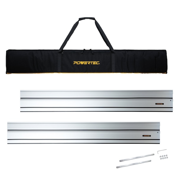 Introducing the Track Saw Guide Rail Kit with Connectors and Carrying Bag by POWERTEC.. This kit was put together to provide you with a high quality set of 55 inch tracksaw tracks (guide rails), along with their connectors. Designed with high quality control in mind, the included components help you pair/ join the two tracks together, lining up square for accurate straight cuts. Our easy-to-use set interacts with the saw base to deliver high precision and balanced results. No matter whether you';re ripping sheet material or cross-cutting, you'll find these tracks easy to set up and extremely versatile for your track saw projects. They are compatible with Ridgid brands. Each track is constructed of professional grade extruded aluminum. They possess a replaceable rubber splinter guard designed to minimize clean-up, while controlling flying sawdust during operation.