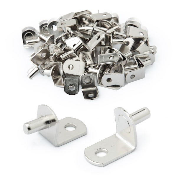 Introducing the L-Shaped Shelf Support Brackets by POWERTEC. These shelf support brackets pegs are designed to support an assortment of shelf installations for wood cabinets, bookcases, closets and other shelving storage needs. A solid pin construction delivers durability and dependable shelf peg support. Whether you're a home improvement professional or DIY projects weekend warrior, these shelf pin supports are easy to install and fit perfectly in 1/4-Inch or 5MM pre-drilled holes to form a pegged surface. Additionally, they are excellent for replacing cheaper quality or plastic shelf pins for a more stabilized and durable hold. PREMIUM DESIGN: Our pin supports are highlighted by an L-shaped bracket-style design and are polished with a beautiful nickle finish to give your projects a professional looking and attractive presentation.