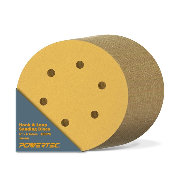Introducing the 6-Inch Hook and Loop Sanding Disc by POWERTEC. This 100 pack of premium quality sanding disc was designed to provide you with a highly durable, fast cutting option that delivers consistent results for an assortment of woodworking, automotive and industrial sanding applications. Although it s ideal for wood, this sanding disc also provides exceptional results on metal surfaces that would clog most other abrasives. They re crafted with aluminum oxide sandpaper, flaunting a ton of heavy duty features that are sure to maximize your work efficiency, while providing you with optimized sanding results. Super fine 320 grit sandpaper that delivers smooth, polished finished surfaces. 6 Hole design for consistent dust extraction, ultimately increasing project productivity. Anti-clogging gold stearate coating that non-loading and offers enhanced durability. Hook and Loop design offers quick and easy removal and replacement. Resin on resin bond delivers outstanding grain support. 6 inch disc are compatible with most 6 random orbit sanders. Package Specifications Quantity: 100 Pack Type: Hook n Loop Disc Size: 6 Color: Gold Grain: AO Grit: 320 POWERTEC is a leading manufacturer of high quality woodworking tools and accessories, machines, and an assortment of OEM replacement parts.