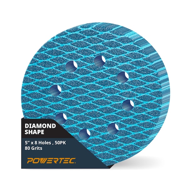 Introducing the 5-Inch Diamond Shaped Sanding Discs by POWERTEC. This 50-piece set of assorted grit sanding discs is your secret weapon for efficient, long-lasting sanding and polishing on a wide range of materials. Diamond Shaped-Sharp Performance: Experience the difference of 5-inch 8-hole hook and loop sanding discs, with diamond shaped grit pattern, engineered to revolutionize your woodworking and auto body projects. The unique design accelerates dust removal and heat dissipation, extending disc life and preventing clogging for smooth, uninterrupted sanding. Master Any Surface: The flexible J-cloth backing conforms effortlessly to curved surfaces, while the durable construction resists tearing and ensures a secure grip on your random orbital sander. Tackle intricate details and challenging angles with ease. Grit Your Way to Perfection: The 80 -grit discs boast a robust flocking backing for superior adhesion and aggressive material removal. Wet or Dry, Your Choice: Whether you're tackling minor wet sanding on stone surfaces like granite or marble countertops, or dry sanding on wood, metal, or drywall, these versatile discs adapt to your needs. Achieve professional-grade results on automotive paint, and everything in between. Note: Not for prolonged soaking Elevate Your Sanding Experience: Say goodbye to premature wear and frustrating clogging. Say hello to unmatched performance, longevity, and versatility, empowering you to conquer every sanding challenge with confidence.