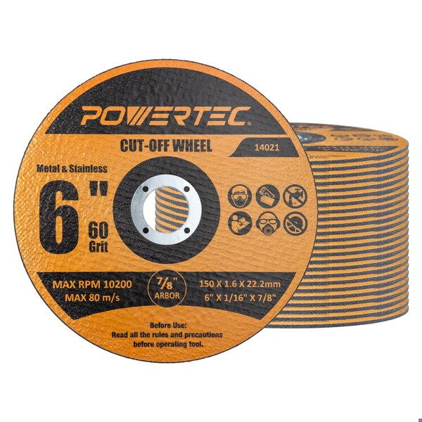 POWERTEC Cut-Off Wheels. High-Performance Cutting Discs for Metal Stainless Steel (3”–14”) Professional-Grade Cutting Performance. POWERTEC Cut-Off Wheels are engineered for fast, clean, and precise cutting on metal, stainless steel, sheet goods, rebar, pipes, auto body panels, and more. With an ultra-thin kerf (1/16”) on smaller sizes and a durable 1/8” profile on the 14” wheels, these discs deliver smoother cuts with minimal burrs and reduced material waste. Durable Abrasive Technology. Each wheel is constructed from iridium-coated aluminum oxide, an upgraded abrasive material that outperforms standard aluminum oxide. This coating provides longer grit life, faster material removal, and consistent performance in both industrial and DIY cutting applications. Reinforced Safety Design. Built with double fiberglass mesh layers, these wheels withstand high operating speeds (up to 20,100 RPM depending on size) for maximum strength, reduced breakage risk, and safer operation. Ideal for angle grinders, die grinders, and cut-off tools. Versatile Size Options. Available in 3”, 4”, 4-1/2”, 5”, 6”, and 14” diameters, with arbor sizes including 3/8”, 5/8”, 7/8”, and 1”, this line of cut-off wheels fits a wide range of grinders and cutting tools. Whether you are working on small precision jobs or heavy-duty industrial projects, there a POWERTEC wheel for every task. Value Packs for Every Job. Choose from bulk packs of 25–50 wheels for ongoing shop use, or the heavy-duty 14” 5-pack for larger metal cutting projects. Each pack is designed to deliver professional performance, job after job.