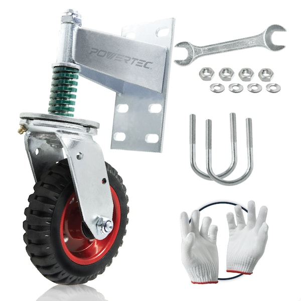 Open the Gate to Smoothness and Durability. Introducing the 6-Inch Gate Caster Wheel by POWERTEC.. Is your gate sagging, sticking, or struggling to roll smoothly? Say goodbye to frustrating gate operation with this 6-Inch Gate Caster Wheel, engineered to provide effortless movement, heavy-duty support, and long-lasting performance. Effortless Rolling, No Matter the Terrain: This fence caster wheel features dual ball bearings and a high-quality rubber wheel that glides effortlessly over various surfaces, from gravel and grass to concrete and uneven terrain. The built-in spring mechanism absorbs shocks and vibrations, ensuring a consistently smooth and quiet rolling experience. Built Tough for the Outdoors:. Crafted with durability in mind, this caster wheel is zinc-plated for exceptional rust resistance, ensuring it can withstand the elements and provide reliable performance year after year. Its robust construction can support gates weighing up to 500 lbs, making it suitable for a wide range of gate sizes and materials. Easy to Use and Install:. Whether you're dealing with a heavy driveway gate, a rustic farm gate, or a charming garden fence gate, this caster wheel is up to the task. The 360-degree rotating design allows for easy maneuverability, while the included mounting hardware and wrench ensure a quick and straightforward installation process. Professionally-Inspired Uses:. Our customers have found this caster wheel to be incredibly versatile, using it for various applications beyond traditional gates: