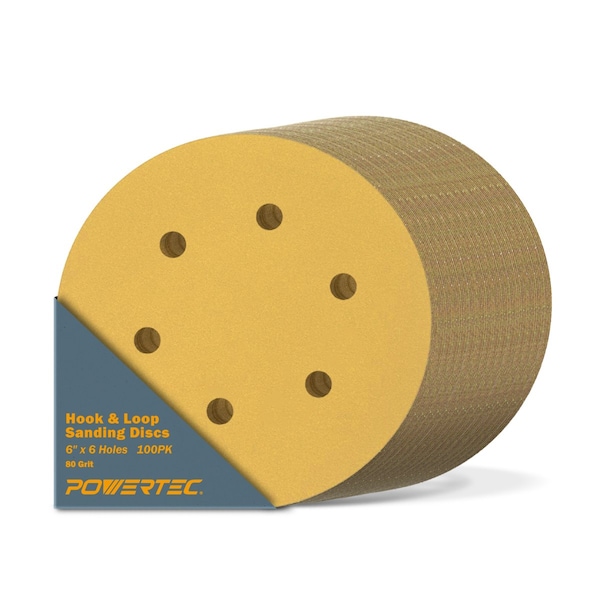 Introducing the 6-Inch Hook and Loop Sanding Disc by POWERTEC. This 100 pack of premium quality sanding disc was designed to provide you with a highly durable, fast cutting option that delivers consistent results for an assortment of woodworking, automotive and industrial sanding applications. Although it's ideal for wood, this sanding disc also provides exceptional results on metal surfaces that would clog most other abrasives. They in.re crafted with aluminum oxide sandpaper, flaunting a ton of heavy duty features that are sure to maximize your work efficiency, while providing you with optimized sanding results. Medium 80 grit sandpaper that delivers smooth, polished finished surfaces. 6 Hole design for consistent dust extraction, ultimately increasing project productivity. Anti-clogging gold stearate coating that non-loading and offers enhanced durability. Hook and Loop design offers quick and easy removal and replacement. Resin on resin bond delivers outstanding grain support. 6 inch disc are compatible with most 6 in. random orbit sanders. Package Specifications Quantity: 100 Pack Type: Hook n Loop Disc Size: 6 in. Color: Gold Grain: AO Grit: 80 POWERTEC is a leading manufacturer of high quality woodworking tools and accessories, machines, and an assortment of OEM replacement parts.
