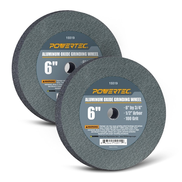 Introducing Aluminum Oxide Grinding Wheel 100 Grit, 6 in. x 3/4 in. with 1/2 in. Arbor by POWERTEC. This grinding wheel disc specifically designed to work with most 6-inch bench grinder machines. This cost-effective tool provides clean, potent edges and surfaces, and is ideal for tool grinding, smoothing blades and metal working. High Performance, High Strength and High Precision Grinding These wheels are virtually chemical resistant and not affected by water, oils, or acids. In addition, they possess a low impact resistant and high wear rate. This abrasive wheel is fast, impressively sharp, and burr-free making it perfect for: Grinding Sharpening Stock Removal Blending Rust Removal Finishing We in.ve paired the aluminum oxide abrasive with a fine 100 grit, allowing this grinding wheel to produce heavy cuts and offer rapid stock removal. This impressive combination offers a high purity profile, making this item perfectly suited to work with carbon steel and tool steel NOT including tungsten carbide, cemented carbide and ceramic tool. Size Specifications and Material Details Abrasive Wheel Diameter: 6 Inches Thickness: 3/4 Inches Arbor Hole Size: 1/2 Inch Abrasive Grit: 100 Abrasive Grade: fine Maximum RPM: 4140