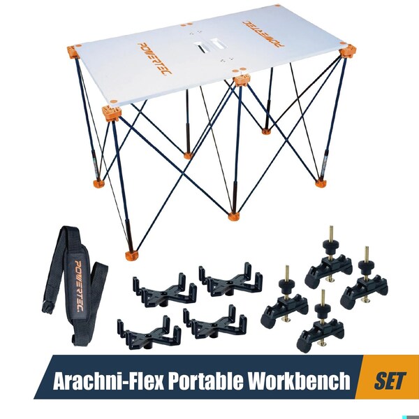 The Foldable Tabletop for Arachni Flex Work Stand by POWERTEC. Designed to fit seamlessly with the Powertec Arachni Flex Work Stand, this tabletop measures 24in x 48in with a sturdy 3/4in thickness and comes with eight quick-insert locks for fast and secure mounting. Whether you're working on wet applications like tile cutting, plaster mixing, or painting, the waterproof PVC surface ensures durability and easy cleanup, making it a reliable choice for any environment. Built with portability in mind, this lightweight and foldable tabletop is easy to transport, making setup and teardown effortless whether you're at a job site, in your garage, or working in your driveway. To further enhance your workspace, you can pair it with compatible accessories like the Powertec 72135 storage/carrying bag (sold separately) for easy organization and transport. Assembly is straightforward with the included user manual, ensuring proper mounting. Just remember to install the insert lock on the inside mounting hole, as the bracket will slightly overhang the tabletop. Say goodbye to time-consuming assembly and cumbersome tools. This foldable workbench unfolds effortlessly, providing a sturdy 2'x4' work surface in an instant. Whether you're on a job site, in your garage, or enjoying a weekend camping trip, this adaptable work table is ready whenever and wherever you need it. Standing at a comfortable 36-inch height, the Arachni Flex Workbench promotes a healthy posture and reduces strain during extended use. No more hunching over or compromising your comfort - focus on your craft and enjoy a more ergonomic work experience. Don't let its lightweight design fool you. This tough-built work stand boasts an impressive 2,500 lbs loading capacity, capable of supporting heavy machinery, power tools, and large workpieces with ease. When you're done, simply fold it down and use the convenient carrying strap for effortless transport and storage.