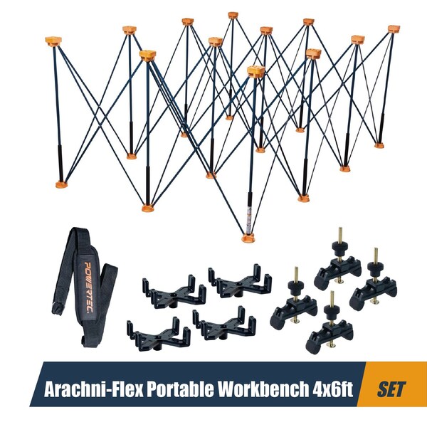 The Arachni Flexible and Portable Workbench by POWERTEC. Say goodbye to time-consuming assembly and cumbersome tools. This foldable workbench unfolds effortlessly, providing a sturdy 4'x6' work surface in an instant. Whether you're on a job site, in your garage, or enjoying a weekend camping trip, this adaptable work table is ready whenever and wherever you need it. Standing at a comfortable 36-inch height, the Arachni Flex Workbench promotes a healthy posture and reduces strain during extended use. No more hunching over or compromising your comfort - focus on your craft and enjoy a more ergonomic work experience. Don't let its lightweight design fool you. This tough-built work stand boasts an impressive 4,500 lbs loading capacity, capable of supporting heavy machinery, power tools, and large workpieces with ease. When you're done, simply fold it down and use the convenient carrying strap for effortless transport and storage. You can take your productivity to the next level with a range of compatible accessories (sold separately). Add folding tabletops with or without dog holes and T-tracks to create a personalized workstation that perfectly suits your needs. POWERTEC is a leading manufacturer of high quality woodworking and construction tools, accessories, machines, and an assortment of OEM replacement parts. We are committed to exceeding expectations, while bringing the latest innovations, technology, and product development to the industry.