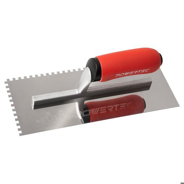 The POWERTEC 72206 Stainless Steel Trowel with 3/16'' x 3/16'' square notch is your go-to tool for clean, consistent mortar application. Whether you're working with tile, cement, or masonry, the premium stainless steel blade offers rust-resistant performance and long-lasting durability. Its square notches ensure even adhesive distribution for a secure tile bond, while the ergonomic soft-grip handle keeps your hand comfortable during long tiling sessions. Ideal for both professionals and serious DIYers, this trowel delivers accuracy, control, and efficiency on every job.