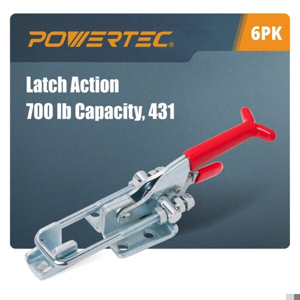 Introducing the Latch Action U Bolt Self Locking Toggle Clamp Set (431) by POWERTEC: These latch action toggle clamps are designed and engineered to provide an adjustable and secure clamping action for many of your woodworking, automotive and heavy duty machinery projects. An absolute must any professional or hobbyist woodworker, the U-shackle (bolt) self-locking design ensures a reliable hold to quickly secure and protect your jigs, fixtures and assemblies optimizing your workflow for multi-tasking and high quality results. Holding Capacity: 700 lbs. Premium Design: This set of large adjustable clamps offer an easy-to-use design, with both, strength and durability at your disposal. They feature red (color coded) vinyl grip handles that deliver an easy, super comfortable gripping profile. The cold rolled steel latch bodies possess rugged construction, enhanced with a zinc plated coating for corrosion and rust resistance. Common Applications , Woodworking, Door Clamps, Machinery, Automotive Applications, Broken Handles, Workbench Joining, Outdoor Activities, Fishing, Rock Climbing. Clamp Dimensions (when closed) 7-1/2" L x 1-7/8" H x 1-5/8" W. POWERTEC is a leading manufacturer of high quality wood work accessories, sanding discs and an assortment of OEM replacement parts. We are committed to exceeding expectations, while bringing the latest innovations, technology, and product development to the industry.