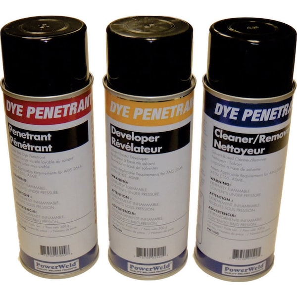 Non-destructive testing (NDT) chemicals; PowerWeld dye penetrant inspection chemicals provide a simple and cost effective method for the detection of surface flaw, cracks and defects. This three step process is applicable for use on materials of steel, stainless steel, aluminum, copper, cast iron, and brass. Defects are clearly visible as shown by a red dye without the need for additional equipment. Meets military, nuclear, ASME and ASTM specifications.