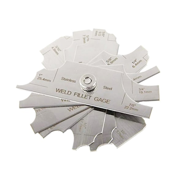 Accurate measurement of eleven (11) fillet weld sizes: 1/8", 3/16", 1/4", 5/16", 3/8", 7/16", 1/2" 5/8", 3/4", 7/8", and 1", and their metric equivalents, to determine weld sizes, either concave or convex; Blades are made of 1-1/4 "x 4" 304 stainless steel to resist rust and bending; Blades are deburred to remove rough edges; All sizes and numerals are engraved into the surface for easy reading