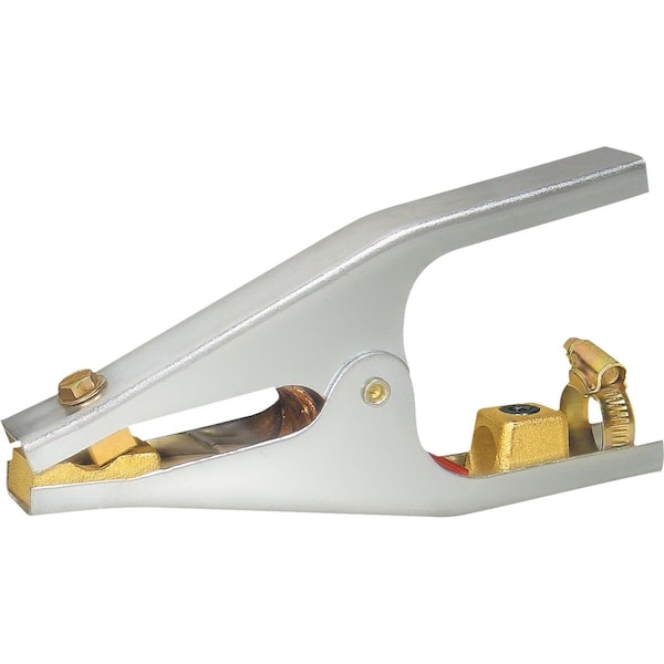 Manufactured from heavy duty nickel plated steel with forged brass conductors and braided copper strap; Heavy duty spring provides postitive strength at jaws; Cable is easy to install with built in cable connector and oval point screw