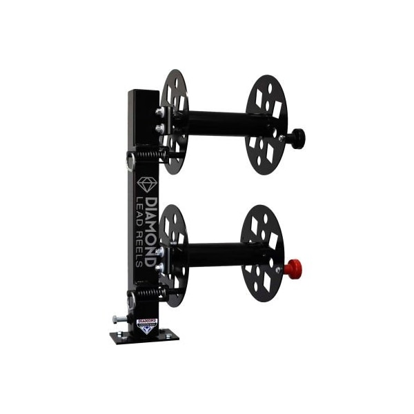 Diamond welding cable lead reel -swivel base double. Swivel base allows for the reel to be turned 360 degrees in any direction of work. Features 2 x 10" reels that hold up to 150' of 1/0 cable. Stays connected to the welding machine all the time for "live reel setup". Reels are fully electrically isolated up to 600 amps. Heavy duty manual friction brake keeps welding cable from becoming uncoiled. Locking pull pins secure cables while not in use. 1/2" terminal connections.