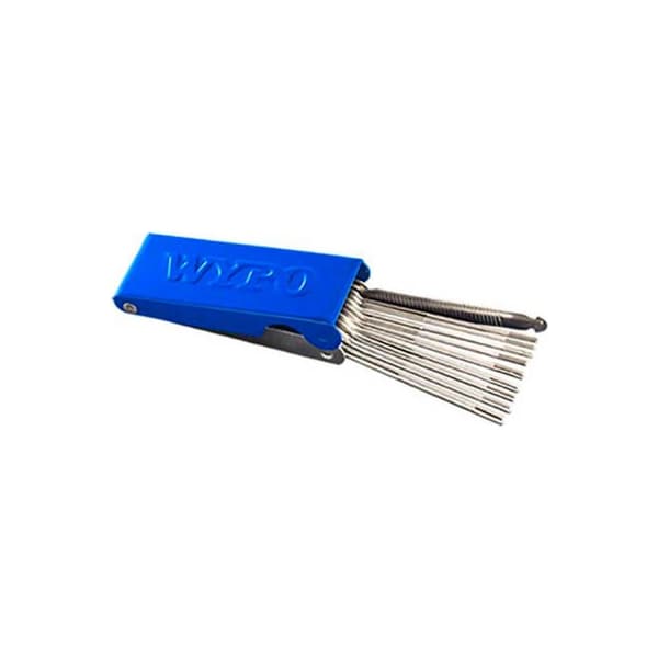 Wypo standard tip cleaner set. 300 series stainless steel wires promotes longer life - no corrosion, no contamination. 13 wires (sizes #6 - #26) have 1" of uniform ridges with tapered smooth pilot to guide the cleaner into the tip, without damage to the port. Attractive powder coated aluminum case with a contained spool assembly that snaps out. File for knocking off debris and tip re-facing.