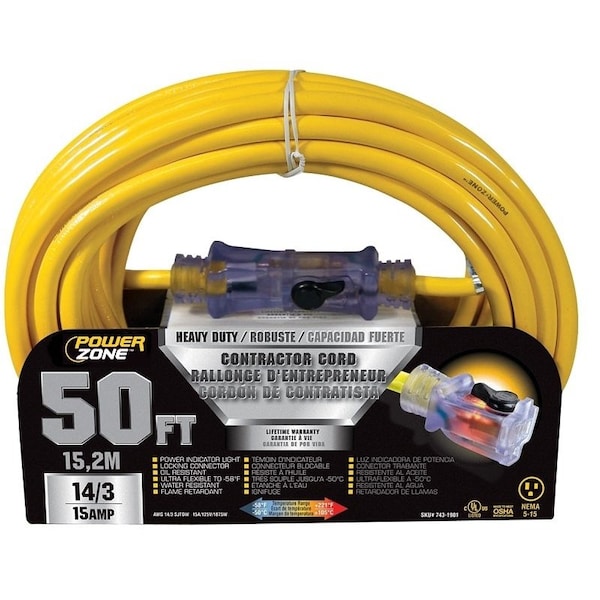 Extension Cord, 14 AWG, Indoor/Outdoor, Yellow, 50 ft