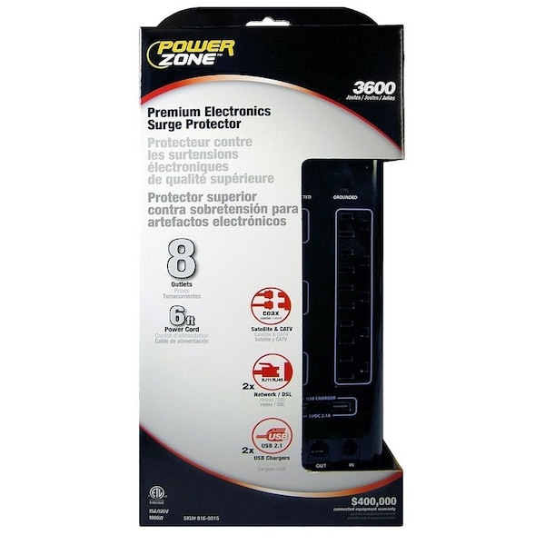 PowerZone Multimedia Surge Protector has 3600 Joules of surge protection and 8 outlets to power everything on your desk or home entertainment system, plus a 2-port USB charger to keep your cell phone and tablet fully charged. This unit also has data line protection for CATV Satellite DSL & Broadband routers.