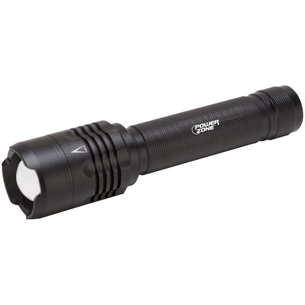 LED Tactical flashlight has a anti-roll head, is water resistant and extends to adjust its focus. High: 2000 lumens, 2 hrs run time/low: 200 lumens, 8 hrs run time. Powered by 9 AA batteries included.