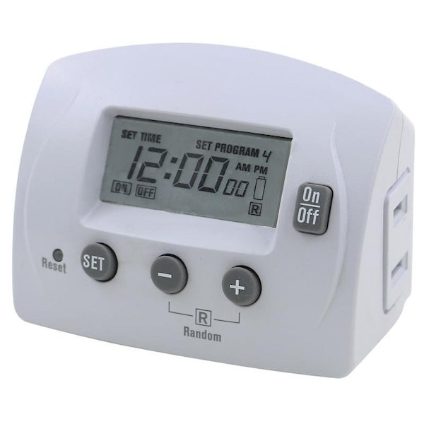 Turns outlets on and off same time daily 24 hr repeat cycle programming 4 programmable onoff settings, multiple settings that repeat daily Only three programmable buttons, simple stepbystep programming Angled housing design and large LCD screen makes unit easy to program and read Random vacation mode adjusts onoff time presets by up to 30 minutes Battery backup maintains presets during power outages Onoff override switch to easily bypass programming Compatible with CFL, LED, fluorescent and incandescent bulbs 8A resistive, 46A tungsten, 12 horsepower
