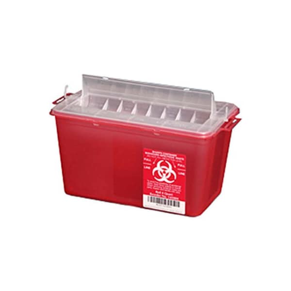 Plasti-products 145004 4-quart sharps container, horizontal entry, red, case of 25 these horizontal entry sharps containers are designed for a touchless deposit of sharps. The automatic rotating chamber is designed to safely deposit sharps into the puncture resistant container. If necessary, sharps can be dropped manually by using the actuating lever. features: horizontal drop maximizes the use of the container puncture resistant molded plastic, translucent red color containers may be nested for compact storage available in sizes small 4 qt., medium 8 qt. and large 14 qt. all sizes may be mounted to the wall using optional wall mounting bracket 4 qt. And 8 qt. Containers are also ideal for countertop use