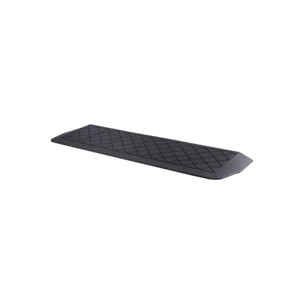 Pvi rubber threshold ramp raez1110 - 12-1/4l x 42w no load limitations made of 100% recycled rubber. Molded miter ends. No load weight limitations. Designed and tested for maximum slip-resistance. Field fitted with simple cutting tools; simple installation. Adhesive required under threshold. Only available in black.