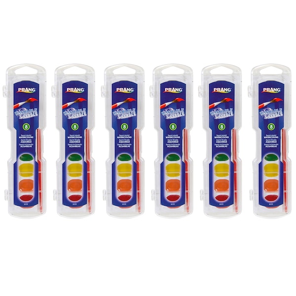 PrangĀ® Semi-Moist Washable Watercolors feature the tuned palette of brilliant colors and intense pigments that have made Prang the watercolors most preferred by teachers nationwide. These washable watercolors easily wash off clothes and skin with soap and water. AP certified non-toxic. Conforms to ASTM standards. Each set includes 8 colors and a brush. Sold as 6 sets.