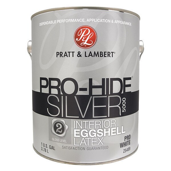 Interior Paint, For Use On Surface Material Drywall, Masonry, Metal, Plaster, Wood, Paint Base Type Latex, Paint Color Family Whites, Color Pro White, Finish Eggshell, Size 1 gal, Coverage 400 sq ft/gal, VOC Content Less Than 50g/L, Dry Time Recoat 4 hr, Paint Sub-Brand Pro-Hide(R) Silver 5000, Paint Cleanup Soap and Water, Dry Time 30 min, Min. Application Temp. 50 Degrees F, Application Method Brush, Roll, Spray, Features Good Hide, Smooth Uniform Finish
