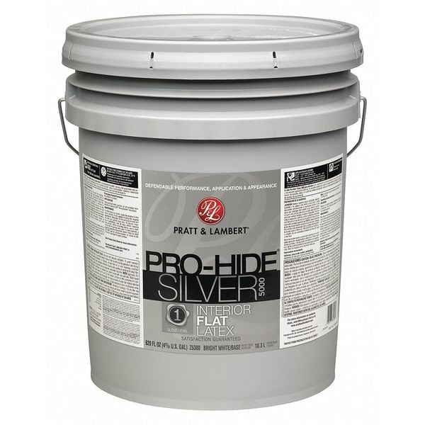 Interior Paint, For Use On Surface Material Drywall, Masonry, Metal, Plaster, Wood, Paint Base Type Latex, Paint Color Family Whites, Color Dover White, Finish Flat, Size 5 gal, Coverage 400 sq ft/gal, VOC Content Less Than 50g/L, Dry Time Recoat 4 hr, Paint Sub-Brand Pro-Hide(R) Silver 5000, Paint Cleanup Soap and Water, Dry Time 30 min, Min. Application Temp. 50 Degrees F, Application Method Brush, Roll, Spray, Features Good Hide, Smooth Uniform Finish