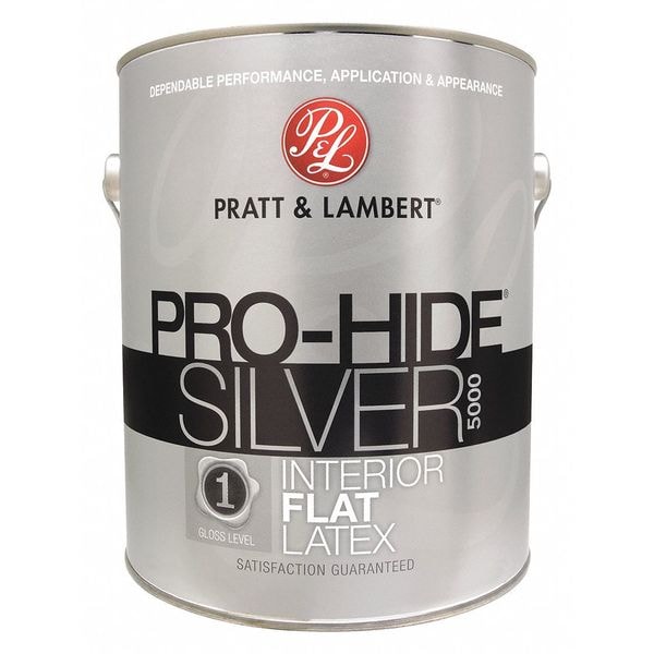 Interior Paint, For Use On Surface Material Drywall, Masonry, Metal, Plaster, Wood, Paint Base Type Latex, Paint Color Family Whites, Color Pro White, Finish Flat, Size 1 gal, Coverage 400 sq ft/gal, VOC Content Less Than 50g/L, Dry Time Recoat 4 hr, Paint Sub-Brand Pro-Hide(R) Silver 5000, Paint Cleanup Soap and Water, Dry Time 30 min, Min. Application Temp. 50 Degrees F, Application Method Brush, Roll, Spray, Features Good Hide, Smooth Uniform Finish